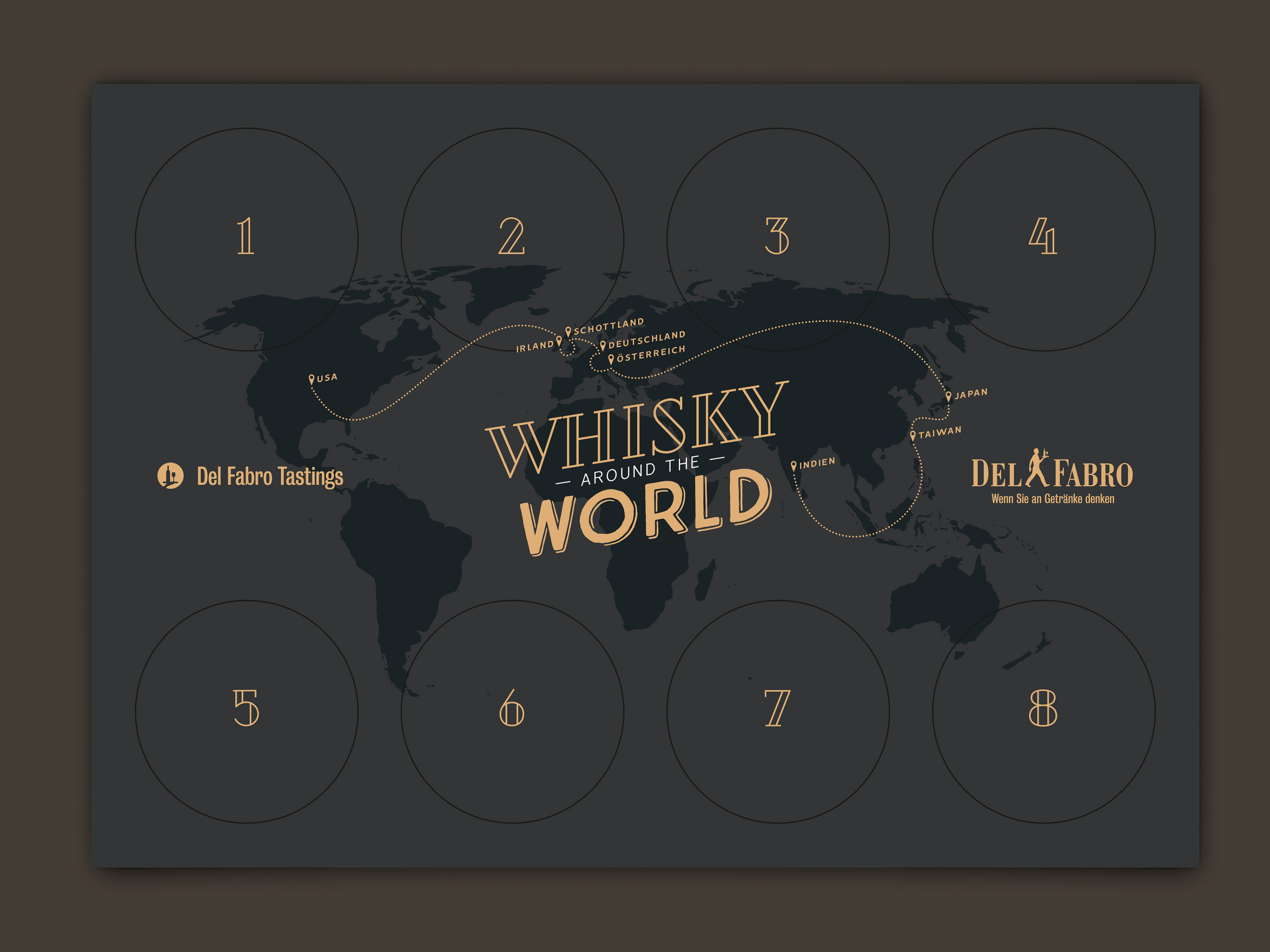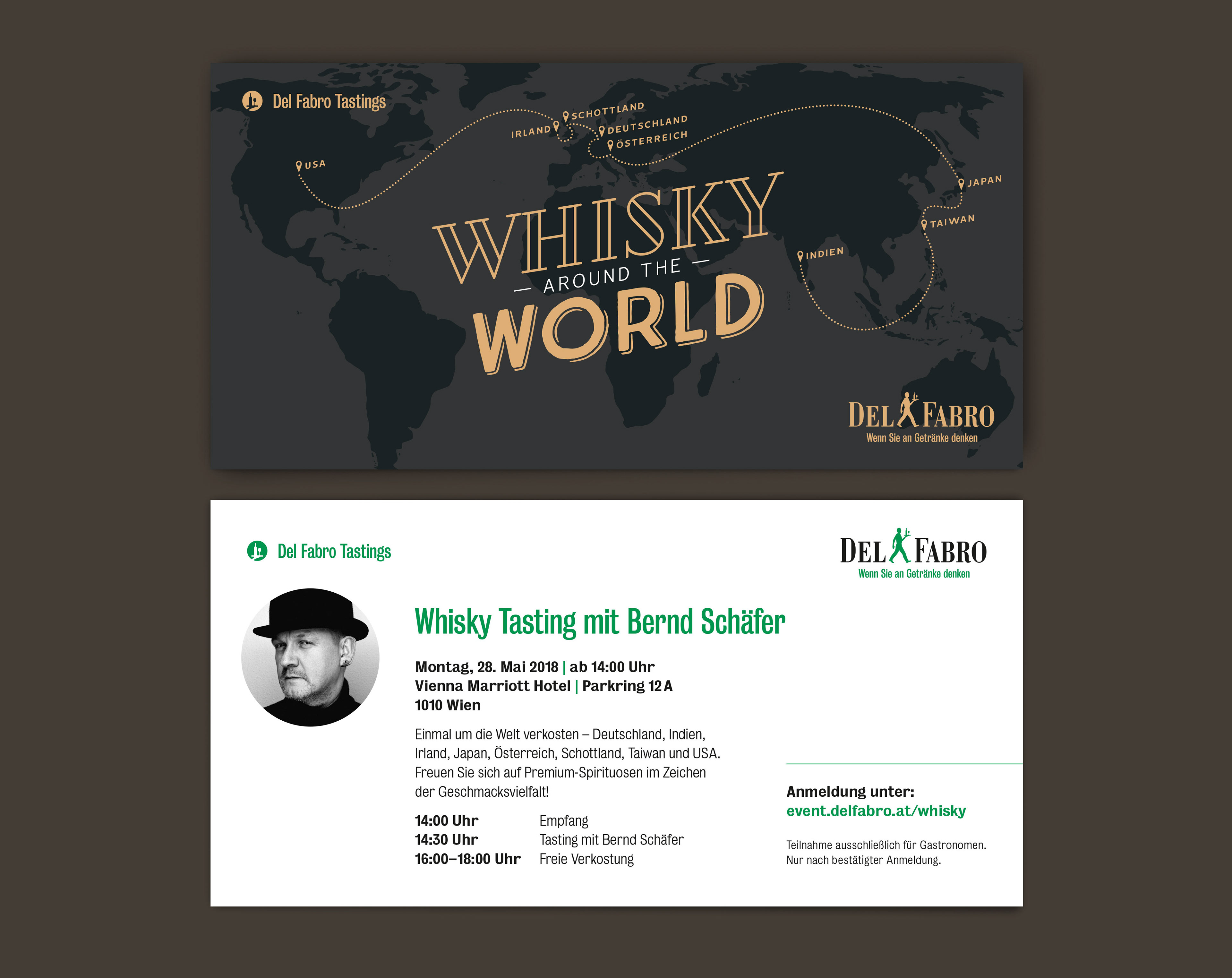 Gestaltung und Konzeption des Einladungsflyers im klassischen DIN-Lang Format sowie einer DIN-A6 Broschüre welche mit der genauen Produktabbildung durch die Verkostung führt. Außerdem wurde für die einheitlichen Präsentation der zu verkostenden Whiskys ein A4 Tischset erstellt.